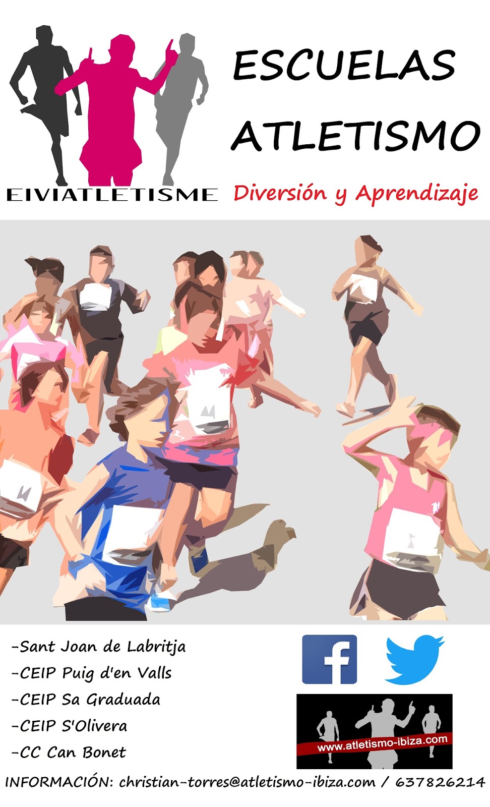 Con la llegada de septiembre damos inicio a una nueva temporada en las Escuelas Deportivas de Eiviatletisme donde lo importante es divertirse y aprender. Este año contaremos con grupos de iniciación al atletismo en Sant Joan, CEIP Puig d'En Valls, CC Can Bonet, CEIP Sa Graduada, CEIP S'Olivera y un grupo de perfeccionamiento en Sant Joan. Además tras el éxito la pasada campaña de la sección de ciclismo seguiremos un año más con Escuela de Btt en el renovado circuito de Sant Llorenç. Y no acaba todo ahí este año contaremos con alguna novedad más. Os esperamos a tod@s!